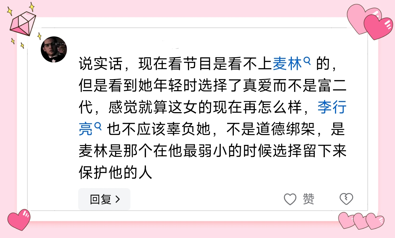“说实话,现在看节目是看不上麦琳的,但是看到她年轻时选择了真爱而不是富二代,感觉就算麦琳现在再怎么样,李行亮也不应该辜负她,不是道德绑架,是麦琳是那个在他最弱小的时候,选择了留下来保护他的人。”