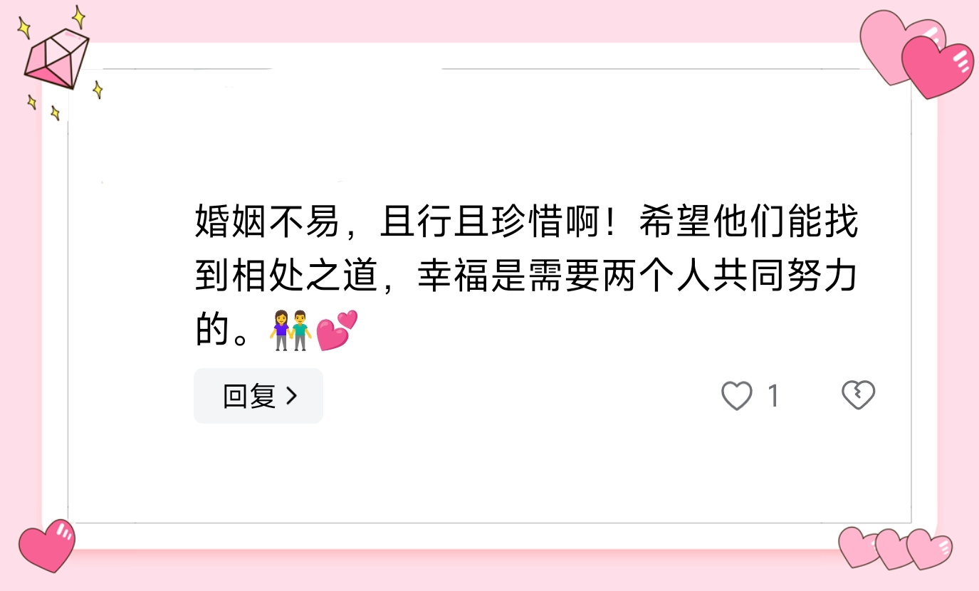 “婚姻不易,且行且珍惜啊!希望他们能找到相处之道,幸福是需要两个人共同努力的。”