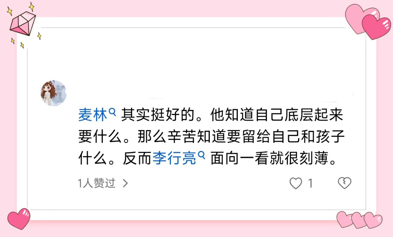 “麦琳其实挺好的。她知道自己底层起来要什么,那么辛苦知道要留给自己和孩子什么。反而李行亮面相一看就很刻薄。”