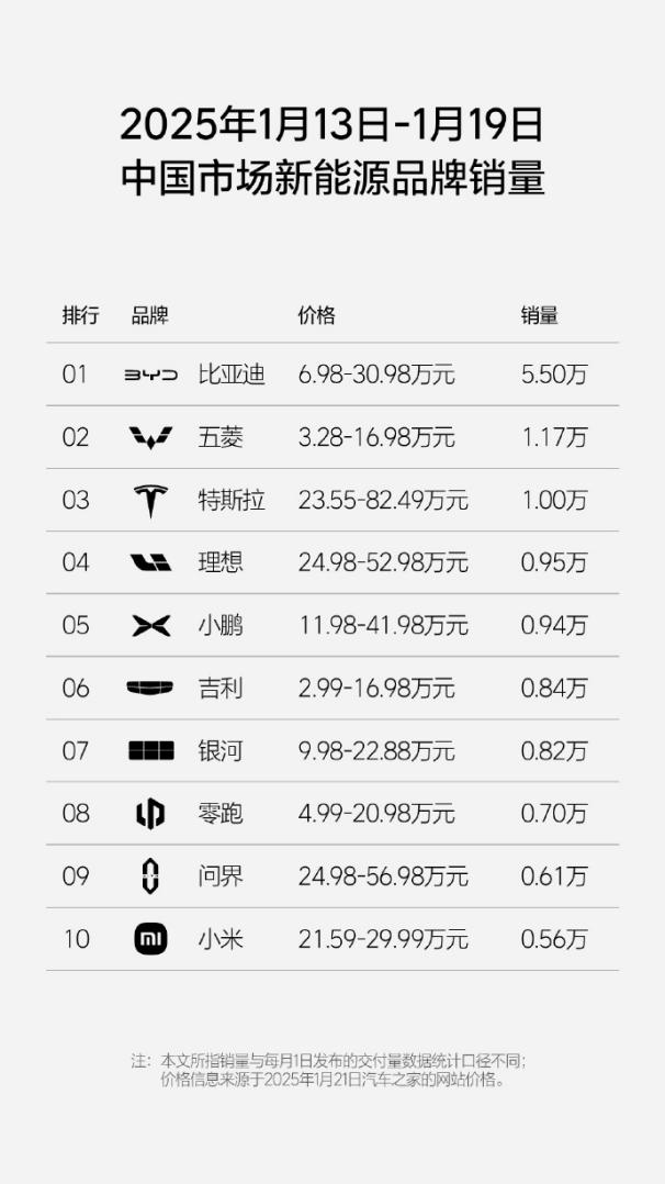 新能源品牌在2025年第3周(1.13-1.19)销量显示,比亚迪销量较上周增长过万,达到5.50万,连续三周低位运行。五菱和特斯拉理想均过万,分列二、三位。理想排在第4,销量为0.95万。小鹏紧随其后位居第5,销量也与理想接近,为0.94万。吉利、银河、零跑、问界排在6-9位,小米以0.56万晋级前十。极氪、蔚来本周继续徘徊在前十之外。