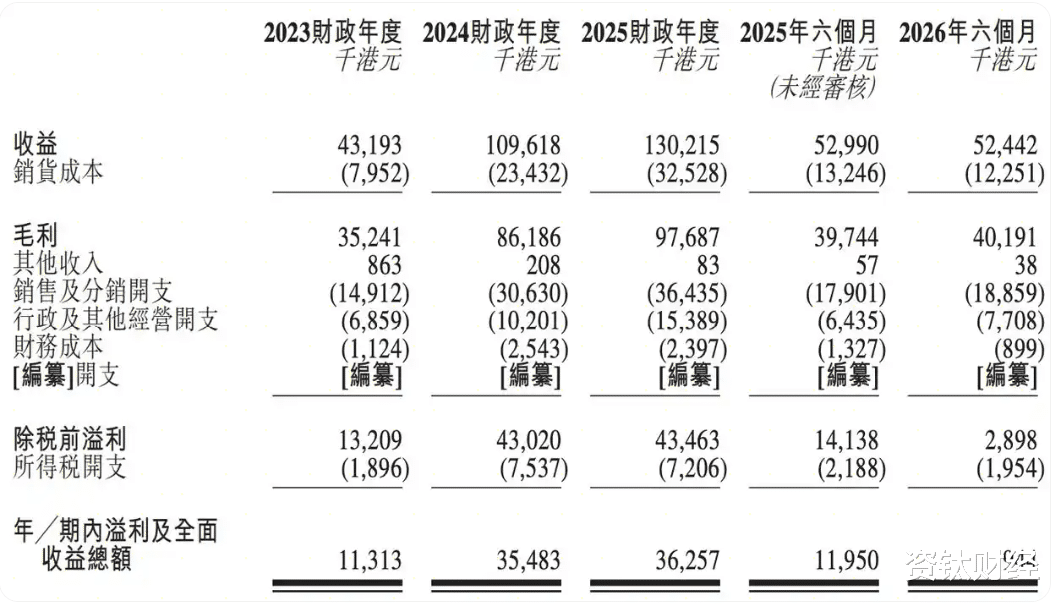 公开财报显示,公司增长动力已明显放缓。2023财年至2025财年,营业收入分别为0.43亿港元、1.10亿港元、1.30亿港元,2025财年同比增长18.2%,增速较此前显著回落;净利润从2024财年的3548.3万港元增长至2025财年的3625.7万港元,增幅仅2.2%。毛利率方面,2023财年至2025财年及2026财年上半年分别为81.6%、78.6%、75.0%、76.6%,虽2026财年上半年略有回升,但整体低于2023财年水平,长期下行压力明显,也反映出轻资产模式下供应链成本上升的隐患,进一步压缩盈利空间。