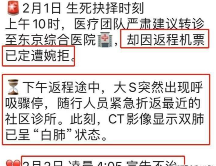 先说大S的去世,这消息一出,好多人都懵了。 春节期间,一家人高高兴兴去日本旅游,结果却遭遇了这样的不幸,真是让人唏嘘不已。据说,大S在日本第一天就咳嗽、喘不过气,这分明是身体在发出求救信号啊!可她却没当回事,硬是坚持旅游,甚至还去了温泉!你说这,是不是有点太冒险了?这就好比你身上带着个定时炸弹,却还非要蹦蹦跳跳,结果可想而知啊! 病情越来越严重,最后不得不叫救护车,可送到医院后,她又回到了酒店……这其中的原因,很多人至今都搞不明白。是舍不得离开家人?还是抱着侥幸心理? 不管怎么说,错过了最佳治疗时机,这才是真正悲剧的开始。