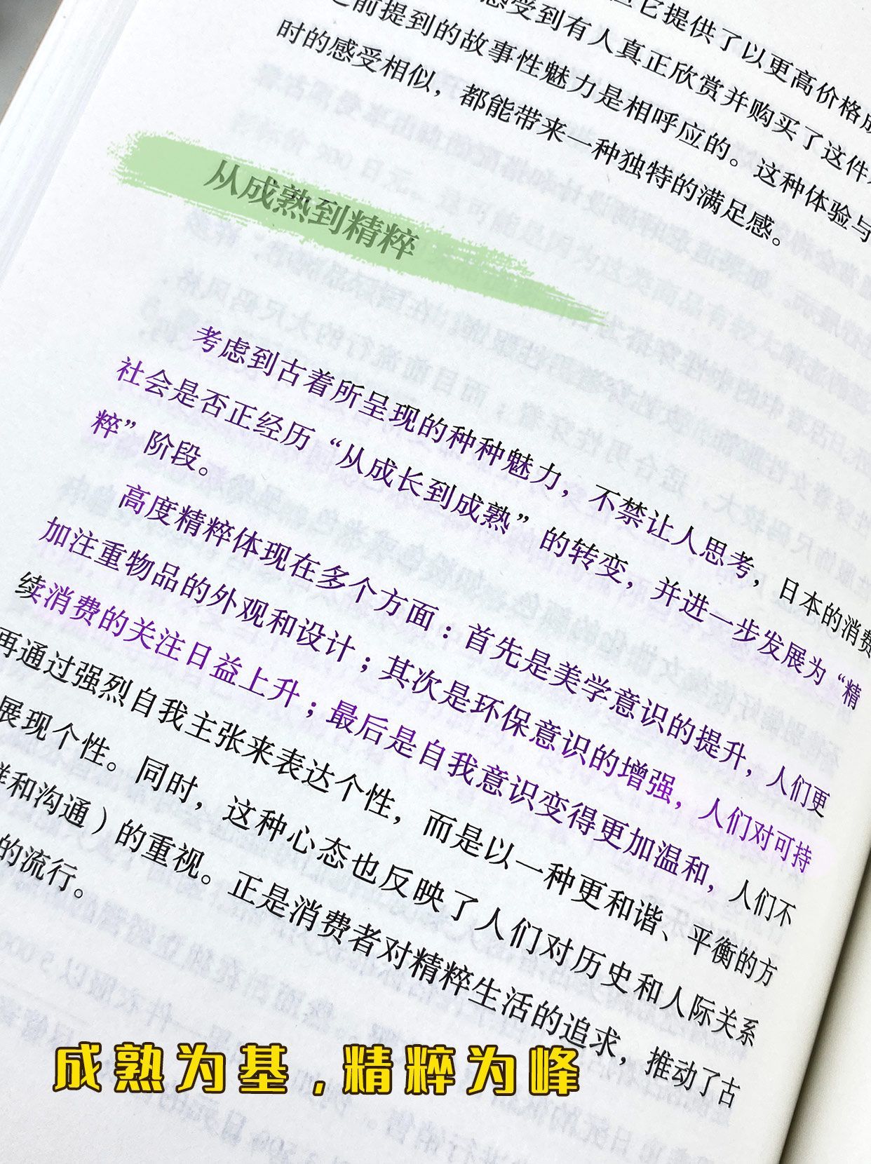 高度精粹体现在多个方面:首先是美学意识的提升,人们更加注重物品的外观和设计;其次是环保意识的增强,人们对可持续消费的关注日益上升;最后是自我意识变得更加温和,人们不再通过强烈自我主张来表达个性,而是以一种更和谐、平衡的方式展现个性。同时,这种心态也反映了人们对历史和人际关系(社群和沟通)的重视。正是消费者对精粹生活的追求,推动了古着文化的流行。
