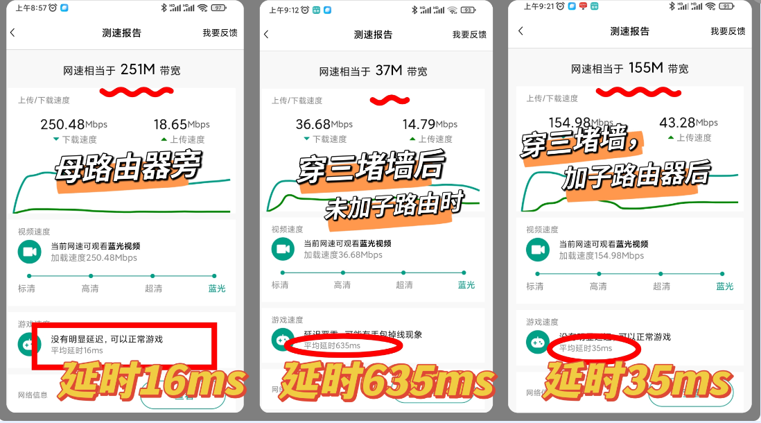 这款母路由器本身也够强大,两堵墙测下来速度好快,没加子路由器也太大感受,干脆直接测穿三堵墙的效果看看!速度分别是: