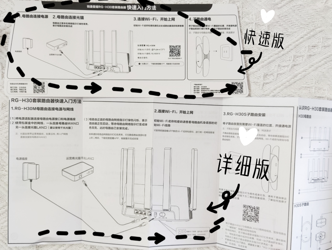 分享一下我的无线串联的安装方式,相当简单:找出光猫——插网线连上母路由器——子路由器碰碰母路由器,听到“滴”的一声,连接好了——子路由器插到你想增强信号的房间去~——over