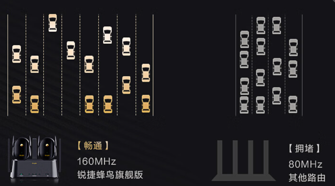 而这款锐捷蜂鸟采用的是160MHz超大频宽,相比传统的80MHz频宽路由器,等于车道翻倍,传输速率翻倍,哪怕家里每个人都手机平板的,也不在怕的!