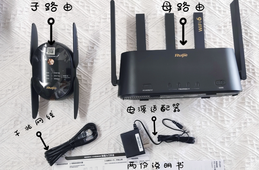目前市面上做子母路由器的不多,选择性还是挺少的,对比了几个品牌,最后锁定的是这款锐捷蜂鸟旗舰版子母套装路由器!有1+1和1+2,我用1+1。这款官方宣传隔两堵墙也依旧能跑满500M。