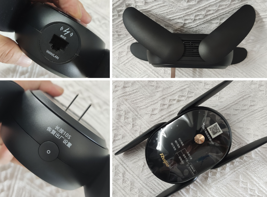 反面用来连接光猫的WAN口特地做成了醒目的黄色,另外还有3个可拓展的网口是灰色,恢复出厂设置的按钮也设置在背后,字体都是刻在路由器上不是容易掉的那种。母路由器是使用电源适配器供电。