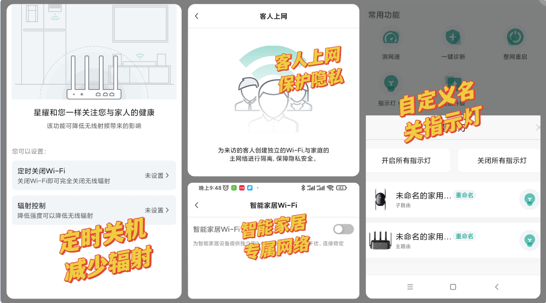 有丰富的使用优化功能,很好~尤其只能家居还能提供独立的wifi通道,太赞了!上网不流畅放下手机享受生活就好,智能家居要响应不及时那可是让人恼火的!