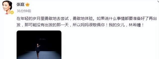 不过这丝毫不影响张庭女儿的亮相,15岁的林家菱化身模特登上了秀台,张庭在个人社交平台也是骄傲的晒出了女儿走秀的照片。