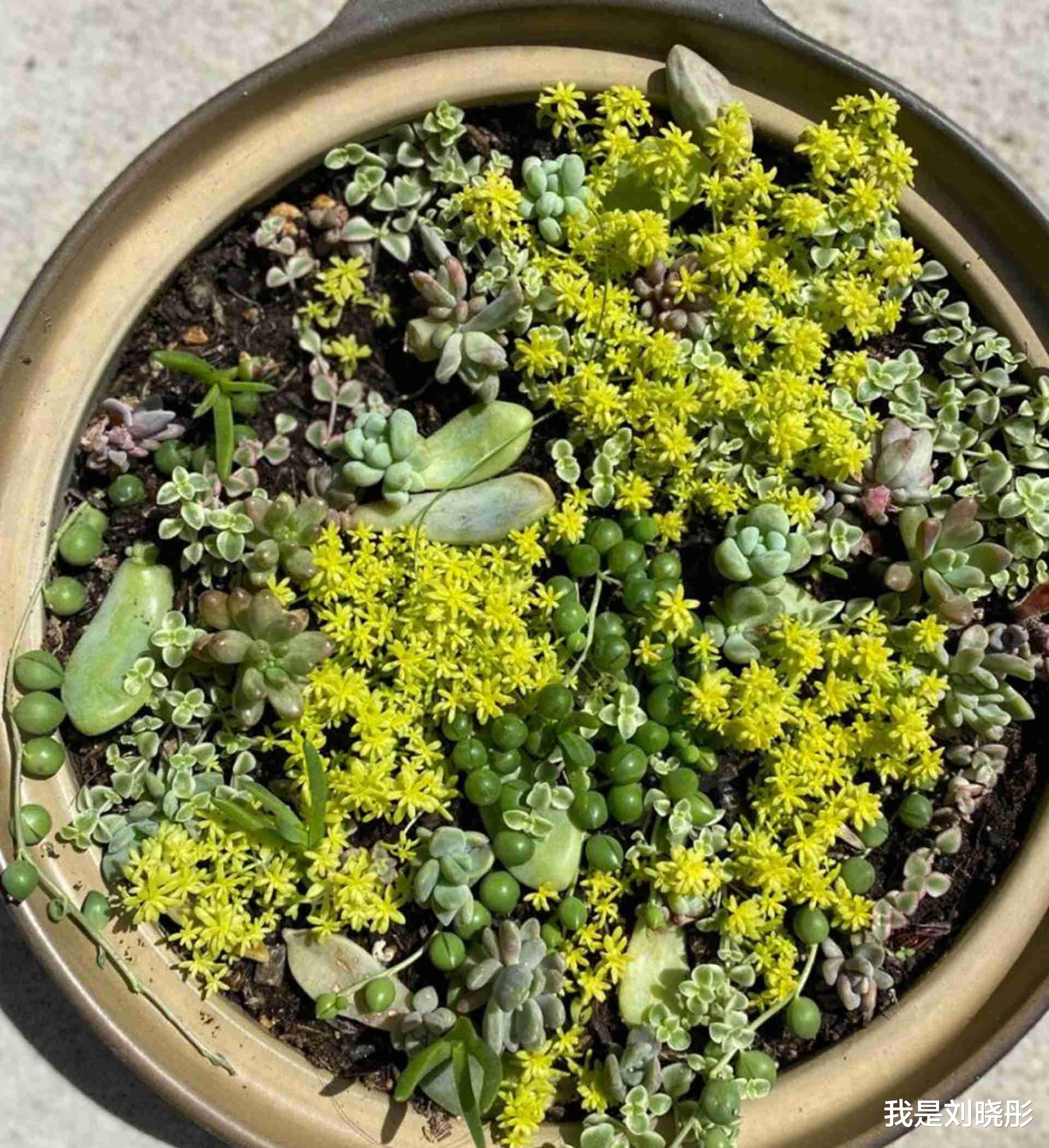 它还能和多肉植物搭配种植。像浙江的赵先生,他在自家阳台把黄金万年草和佛珠吊兰搭配种在一起,效果特别好,两种植物的颜色和形态相互映衬。