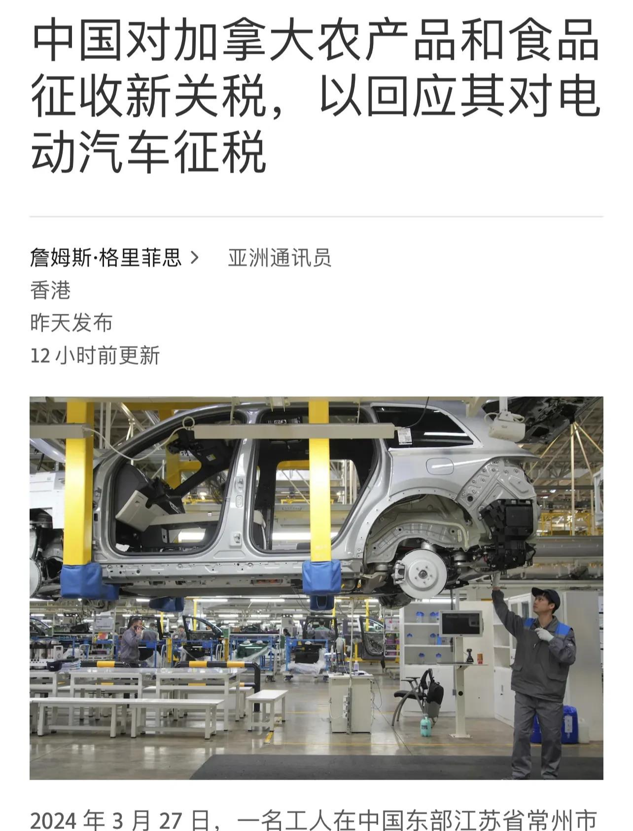 在这场国际贸易的烽火中,加拿大媒体激情四溢地报道,北京挥舞关税大棒,宣布对一系列加拿大进口农产品实施重磅报复性关税,这是对去年秋季加拿大对中国电动汽车、钢铁和铝产品所设关税的强硬回击。中国毫不留情地对菜籽油和豌豆下手,施加了100%的关税壁垒,而对猪肉和水产品也祭出了25%的关税大闸——仿佛是要让加拿大感受到与他们对电动汽车、钢铁和铝的关税相当的压力。