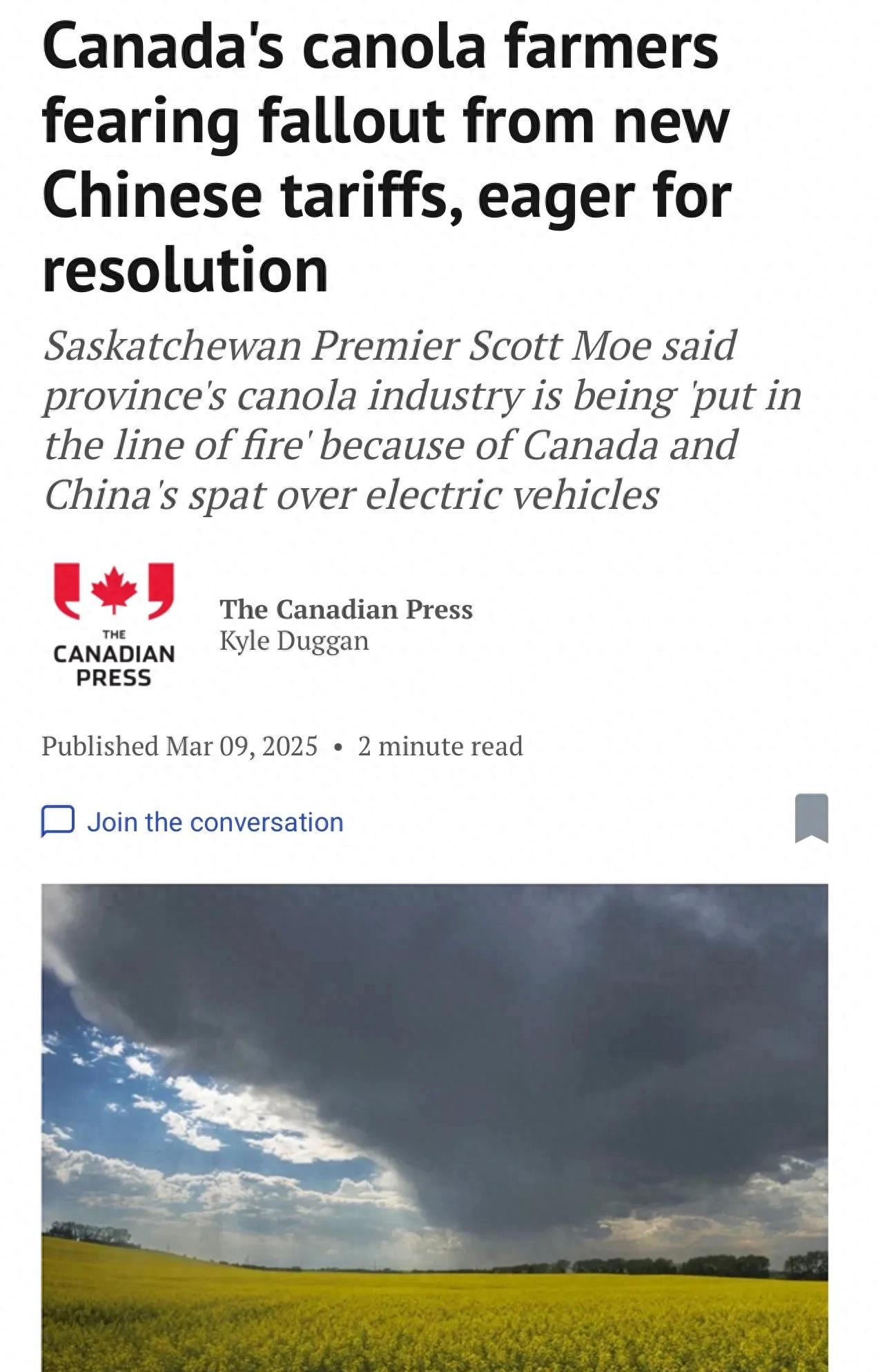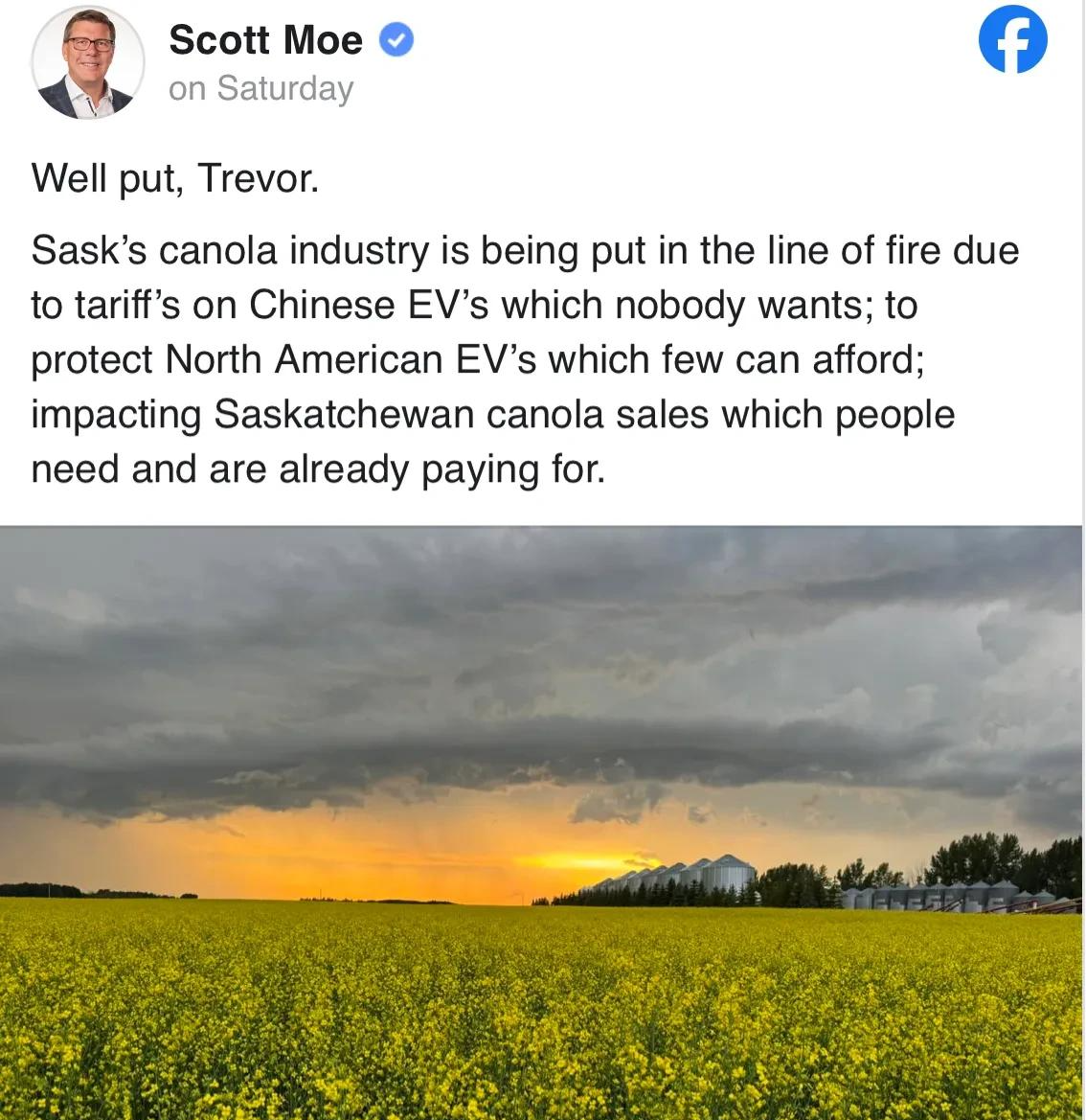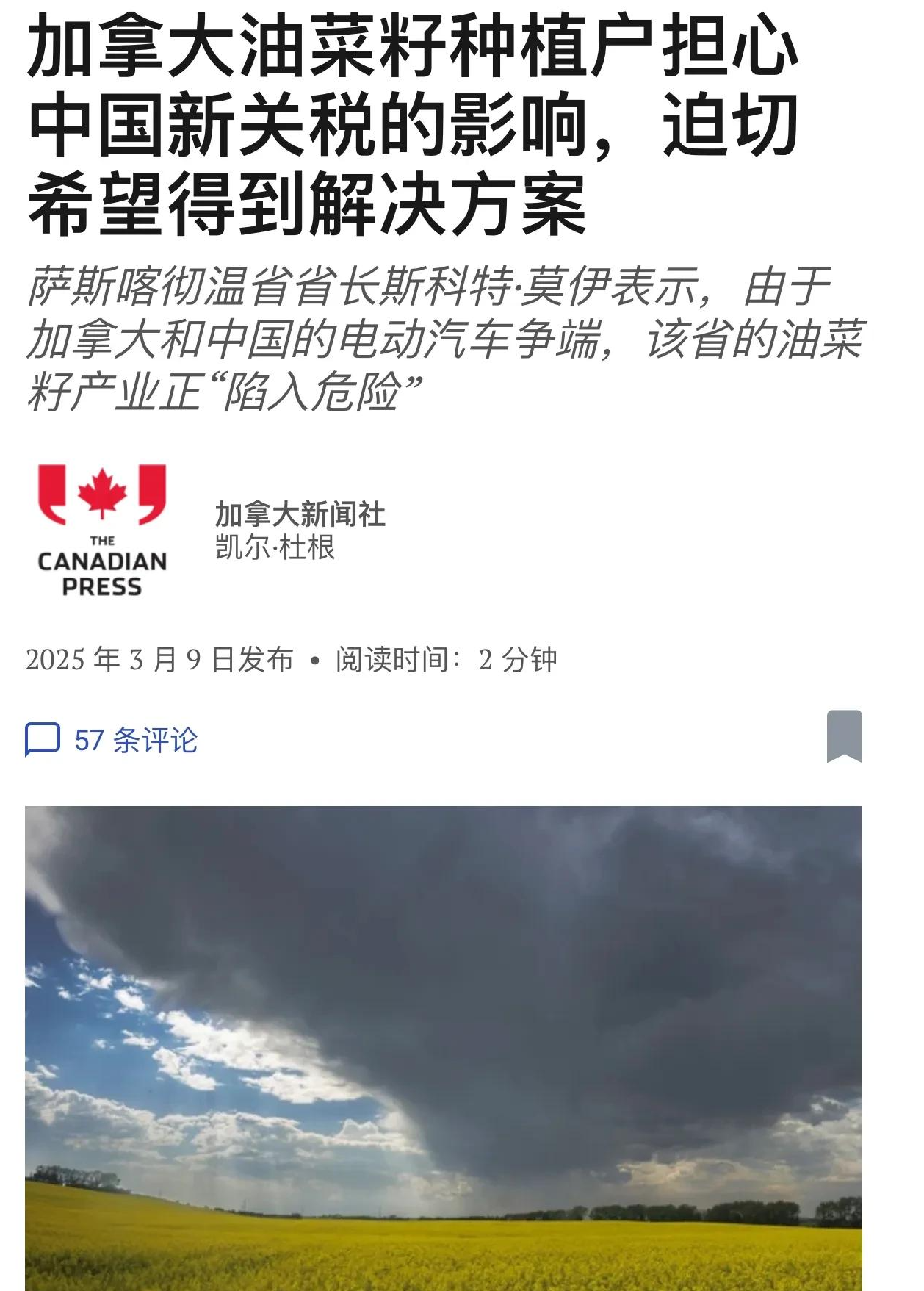在加拿大的广袤土地上,不仅仅是联邦高层的身影在忙碌,连地方官员也按捺不住心中的忧虑。就在上周六,萨斯喀彻温省的省长斯科特·莫伊在社交媒体上发出了紧急预警:“我们的油菜籽产业正面临一场危机!这一切皆因美国对中国电动汽车挥舞关税大棒,导致中国电动汽车无人问津,而我们的北美电动汽车却成了香饽饽,加拿大,就这样成为了特朗普与东方大陆角力的无辜牺牲品!”