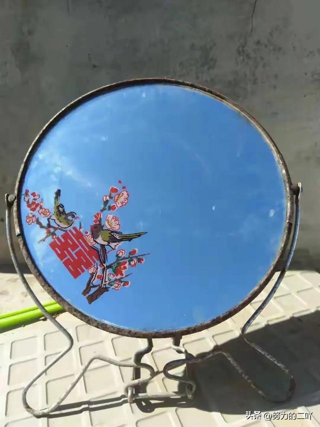 老式镜子圆圆的,蓝色的底子上画着花、鸟还有喜字,看着就特别喜庆。以前的姑娘,早上起来第一件事就是坐在镜子前面梳头、打扮。这镜子,照见过姑娘最好看的样子,也映出过一家人围坐在一起的温馨画面。现在的镜子又大又清楚,可总觉得少了以前那种感觉。