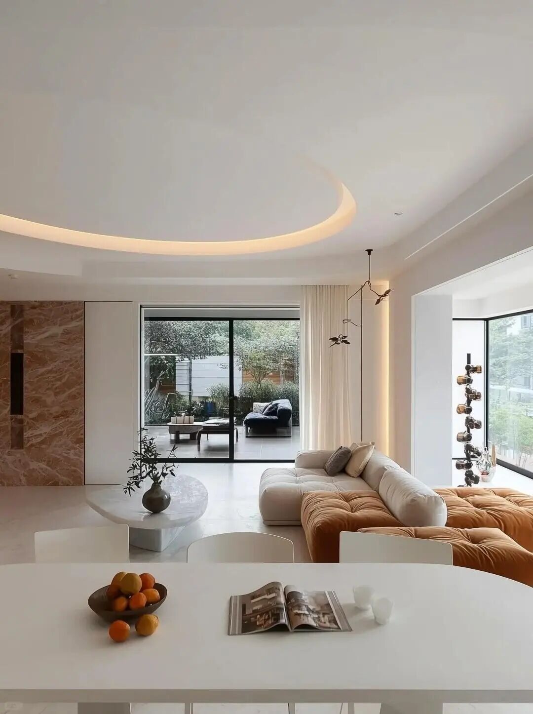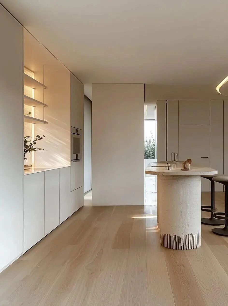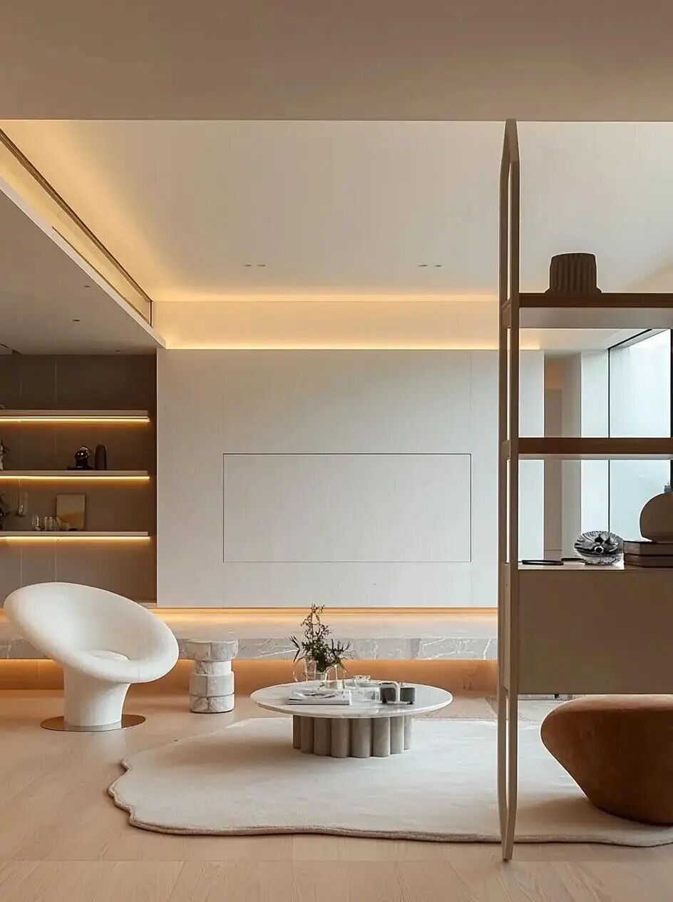 弧形隔断的温柔美学▫️当直线遇上弧线,空间便有了呼吸感~浅灰调墙面画出流畅C形曲线,嵌入式灯带在暮色里晕染出光晕,开放式