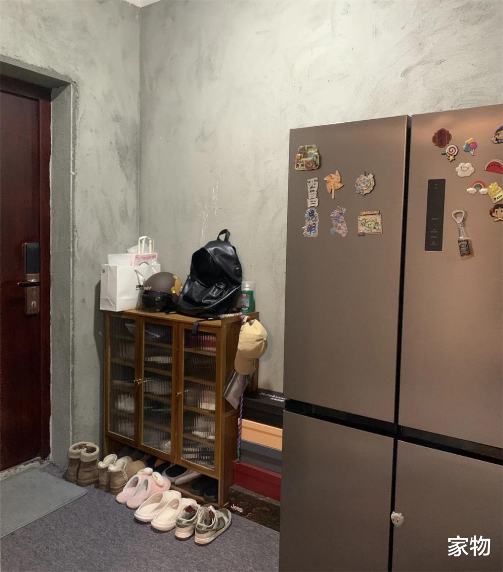 推门进入家中的玄关后,有一个单独的玄关,原本是预留有做定制玄关柜的空间,但现在只是放下一组小号的成品鞋柜,方便收纳两人的鞋帽和随身用品,甚至为了节省空间,连大冰箱也直接放在了玄关里。