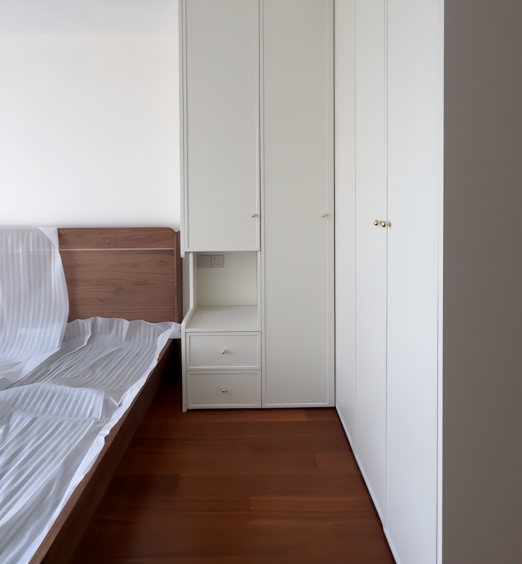 因为在小卧室中放上床头柜之后,真的很占地方,比如,放了床头柜可能会影响到柜门正常开启,每次打开衣柜的时候,你都要将床头柜给移开。