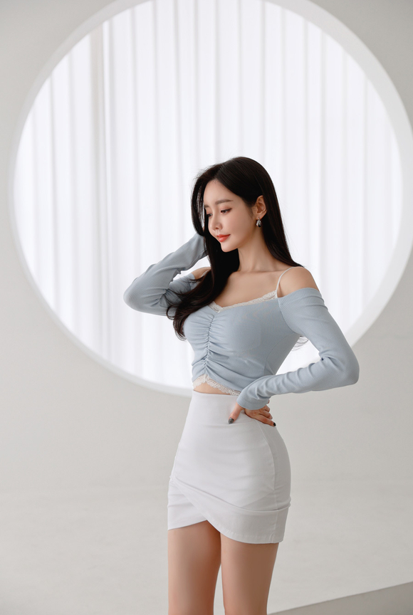 上衣是一件淡蓝色的露肩长袖,设计简约而不失性感。露肩的设计巧妙地展现了女孩的锁骨和肩部线条,给人一种既性感又不失优雅的感觉。这种设计不仅能够突出女性的颈部线条,还能够在视觉上拉长颈部,使整个人看起来更加修长。同时,露肩的设计也增加了整体造型的时尚感,使其在众多穿搭中脱颖而出。
