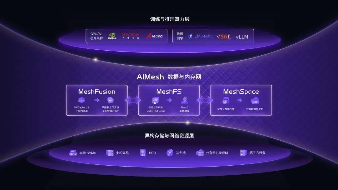 MeshFusion 运行在 GPU 服务器内部,通过创新的软件栈将本地 NVMe SSD 资源池化,转化为可供 GPU 直接调用的 L3 级外部内存。