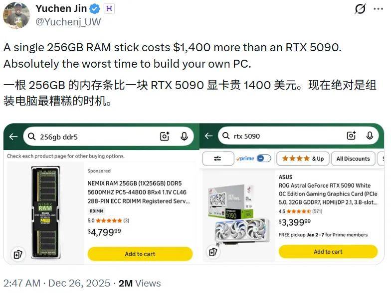 一根 256 GB 内存条标价 5000 美元?这个价格已经轻松超过了英伟达顶配显卡 RTX 5090 的市场溢价。