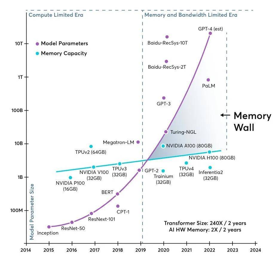 典型的「内存墙」:2018 年至 2025 年期间,Transformer 模型尺寸每 2 年增长约 19 倍,而每个加速器的内存每 2 年仅增长约 1.9 倍。不仅如此,过去 20 年间,峰值计算能力增长了约 6 万倍,但 DRAM 带宽仅增长了约 100 倍,互连带宽也仅增长了约 30 倍。结果就是:处理器闲置等待数据。来源:ayarlabs.com