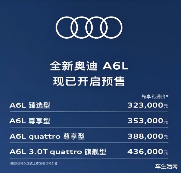 3月10日,一汽奥迪官方宣布,全新一代奥迪A6L正式开启预售,共推出4款车型,先享礼遇价区间为32.3-43.6万元,新车预计将于3月内正式上市。作为奥迪在华核心战略车型,全新A6L完成全面换代,从平台、设计到智能、动力实现全方位革新。