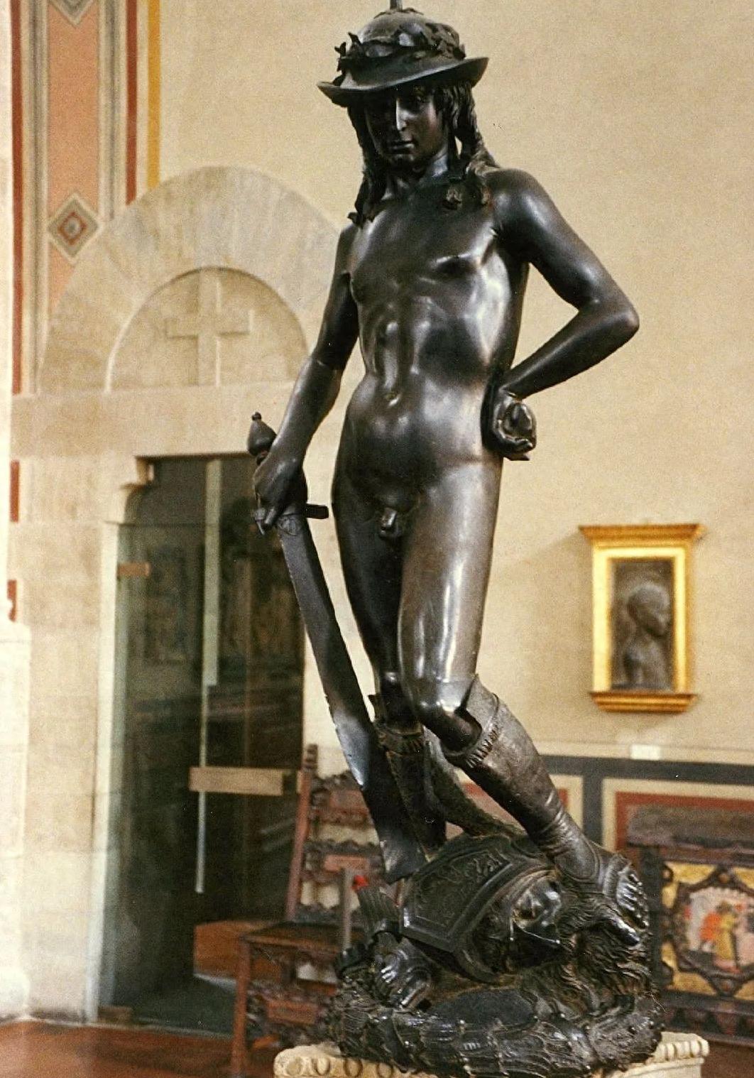 多纳泰罗借助人体解剖学知识,塑造出这个少年英雄的形象,他那自然流露出的胜利感,仿佛在说,“战斗不过如此,轻松一击便胜利。