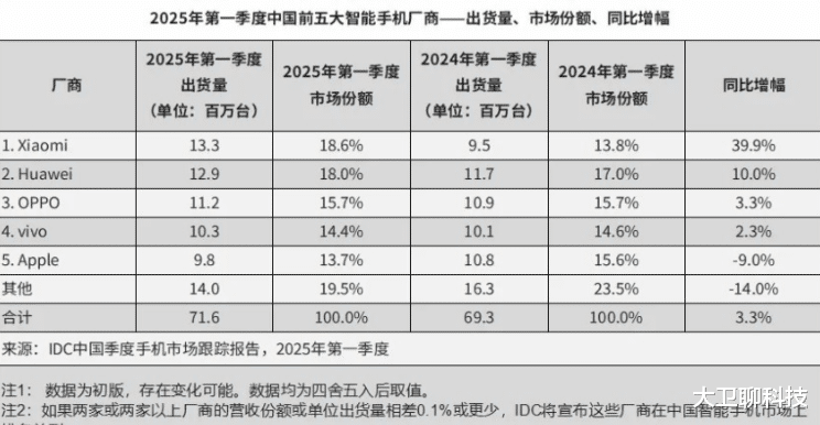 排名第一的是谁?让人很意外,小米!时隔多年,小米终于回到了“中国第一”的位置,实属不易。2025年Q1季度小米手机的出货量达到了1330万部,占据了18.6%的市场份额,领先华为0.6%,优势并不大。但让人没想到的是,小米的同比增幅达到了39.9%!