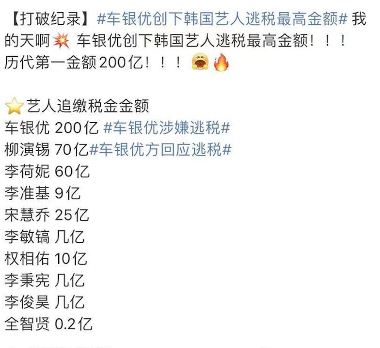 值得注意的是,此200亿韩元并非为具体逃税金额。