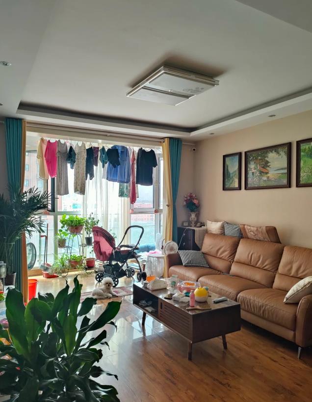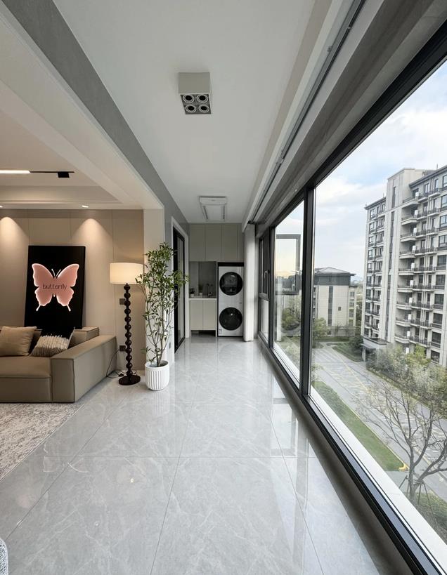 坐在客厅,阳台侧方晾的衣服几乎隐形,根本看不到,这样既能满足晾晒衣服,又不影响整个客厅的美观度,