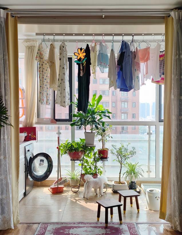 在阳台冬天观雪,夏天听雨,毫不惬意。但现实生活中不管阳台再怎样布局装修,都少不了一点,要阳台要在阳台晾衣服。