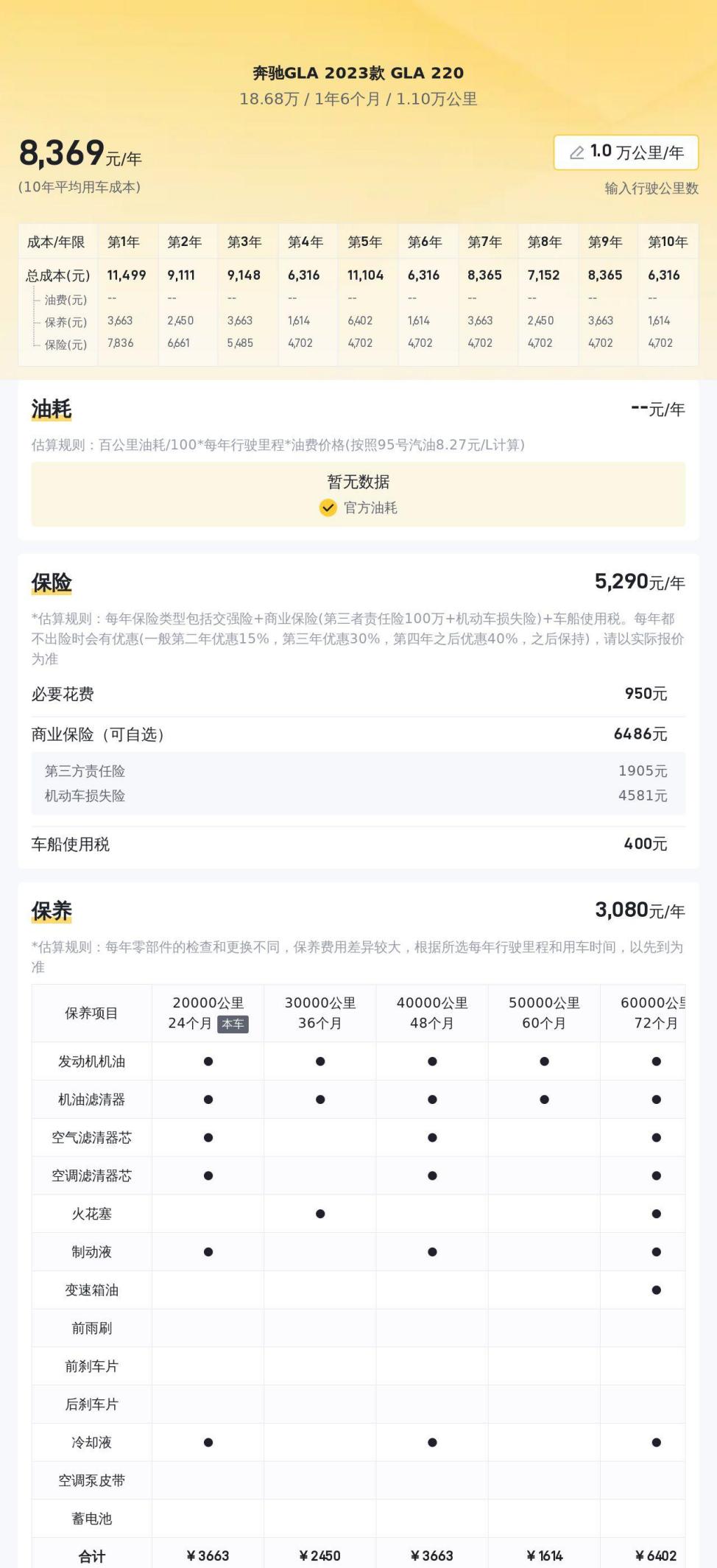 除了车况和配置,我们还需要考虑后期的养车成本。豪华品牌的维修保养费用普遍较高,这辆GLA 220也不例外。根据数据统计,它的10年平均养车成本大约在每年1.3万元左右,包括保险、保养、油费等。这对于预算有限的消费者来说,需要慎重考虑。