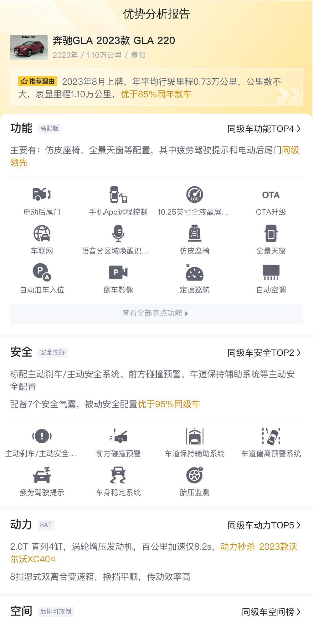 最后,保值率也是一个不容忽视的因素。一辆车的保值率越高,意味着未来的二手车残值越高,也就意味着你购买这辆车的实际成本越低。根据市场行情,这辆GLA 220预计2年后仍可卖出15万元,保值率相对较高。这意味着即使你使用一段时间后选择换车,也不会造成太大的经济损失。