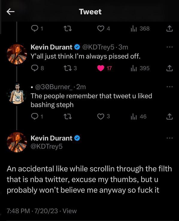 随后,杜兰特取消了点赞,但还是被网友截图保存了下来。在后来杜兰特和网友聊到这件事情的时候,杜小帅解释道:那是一个意外的点赞,往下划推特的时候点到的,请原谅我的大拇指们,但你大概也不会相信我的说法,所以,算了汤姆的吧!随后杜小帅感觉有点尴尬,删掉了这个解释的推文。
