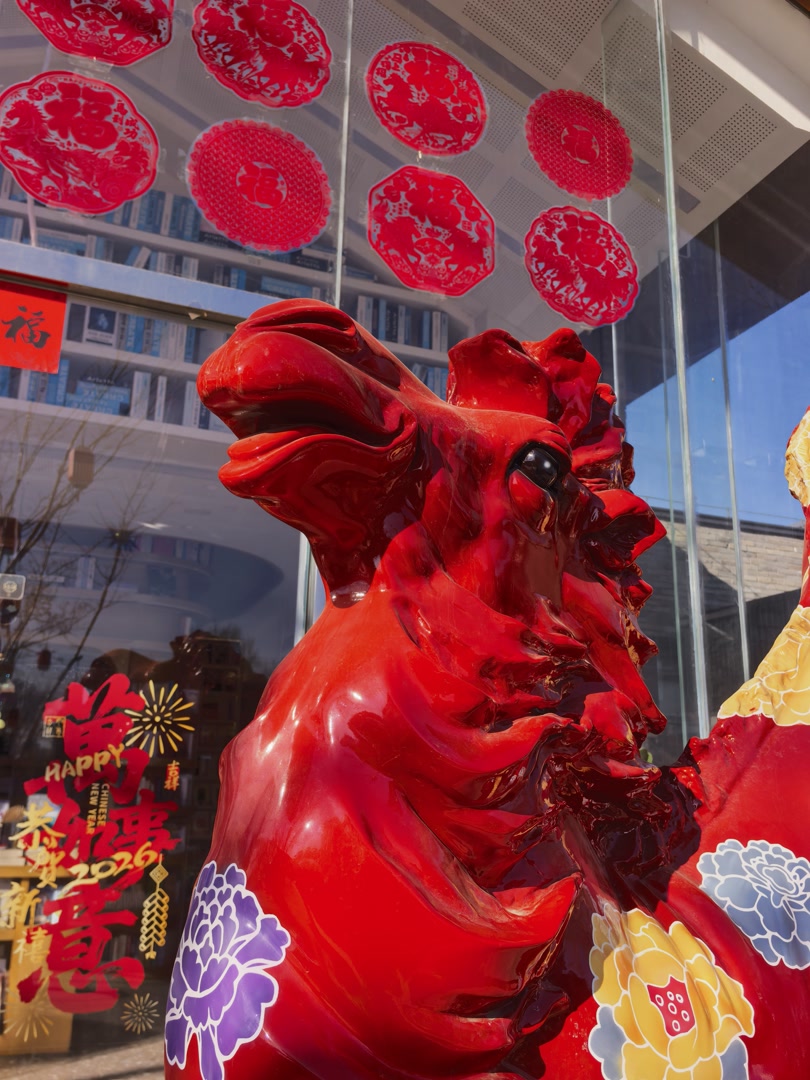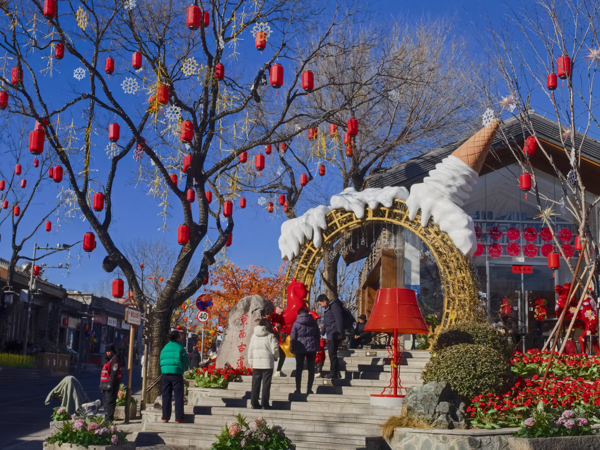 1月31日,来到北京模式口历史文化街的游客会发现,为了迎接新年,古街已经被装扮一新。大红灯笼、马元素挂画、举着糖葫芦的大雪人……年味十足的装饰把整条古街的喜庆氛围直接拉满!