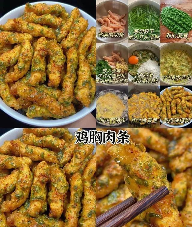 鸡胸肉条是将鸡胸肉削成长方块,加入调味品煎炸而成的一道菜,主要成分为鸡胸肉。