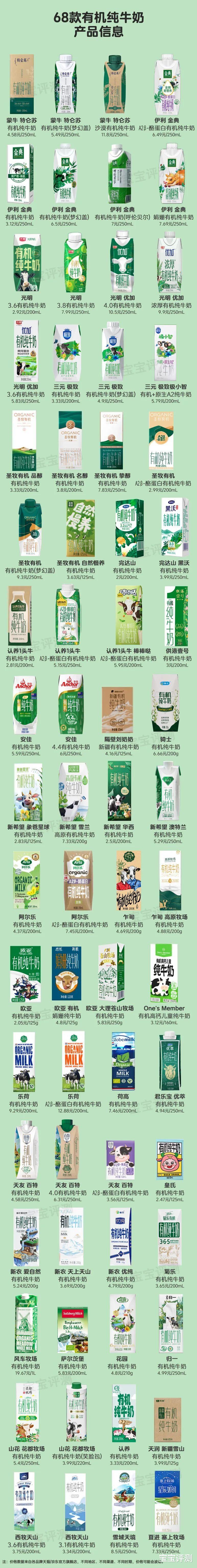 2、本期横评的68款有机纯牛奶均为灭菌乳,都是仅以有机生牛乳为原料、不添加防腐剂、可在常温密闭环境下长期保存的产品。