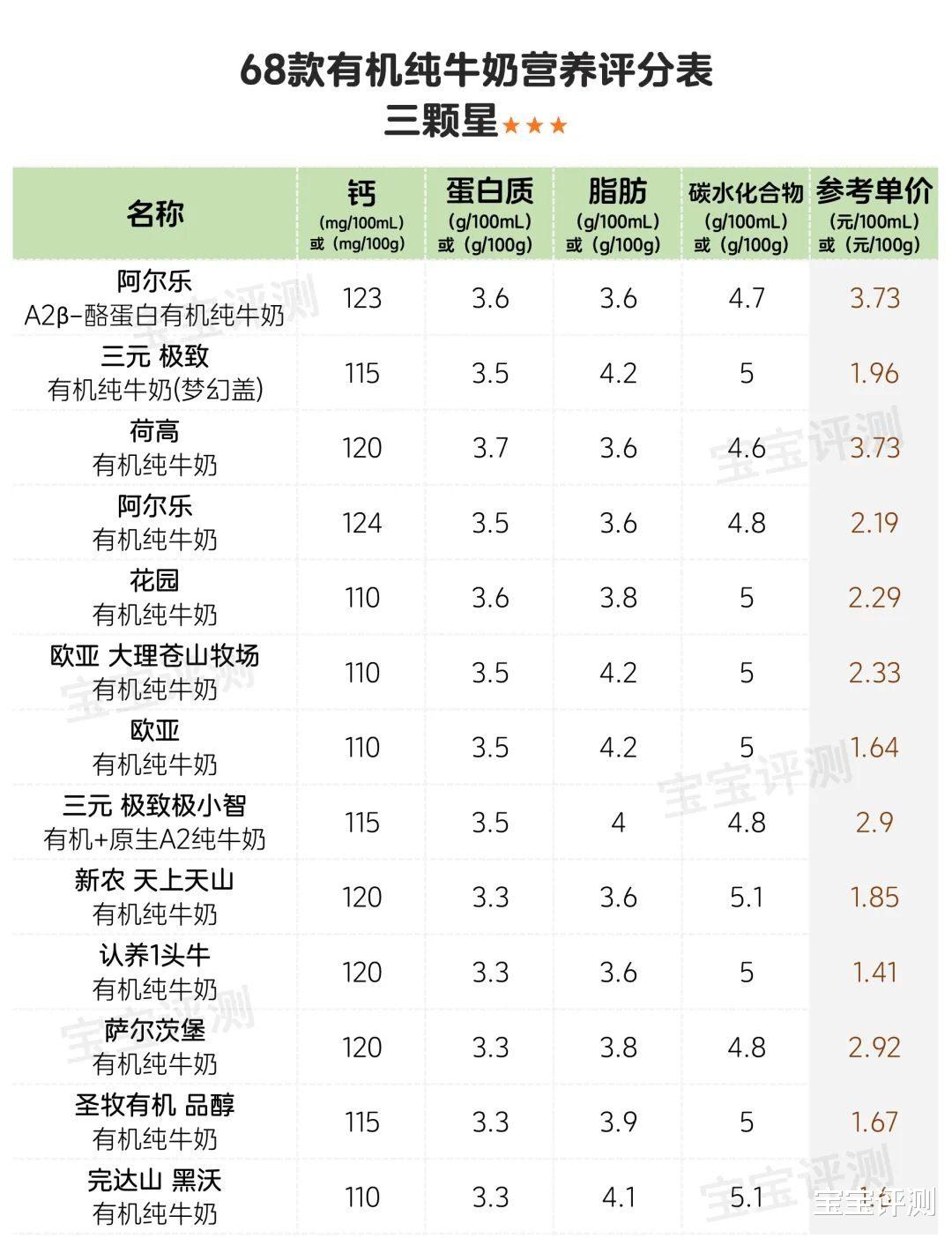 13款“三颗星”有机纯牛奶,平均钙含量约116mg/100mL左右,平均蛋白质含量在3.5g/100mL左右,脂肪的平均含量在3.9g/100mL左右,碳水化合物的平均含量在4.9g/100mL左右。