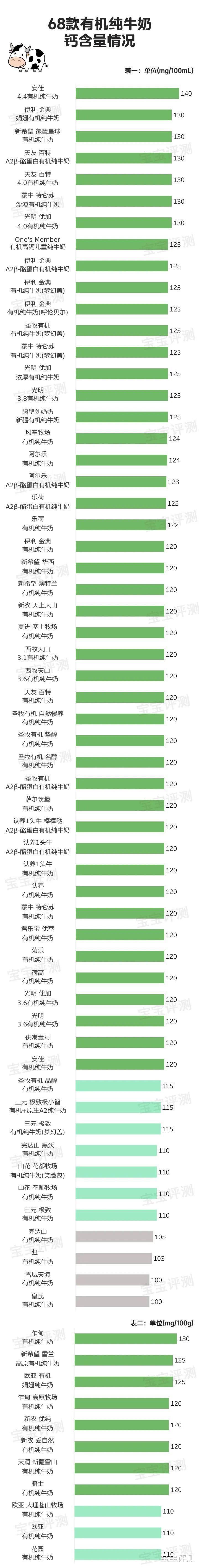 2、68款有机纯牛奶的钙含量在100-140mg/100mL(100g)之间。