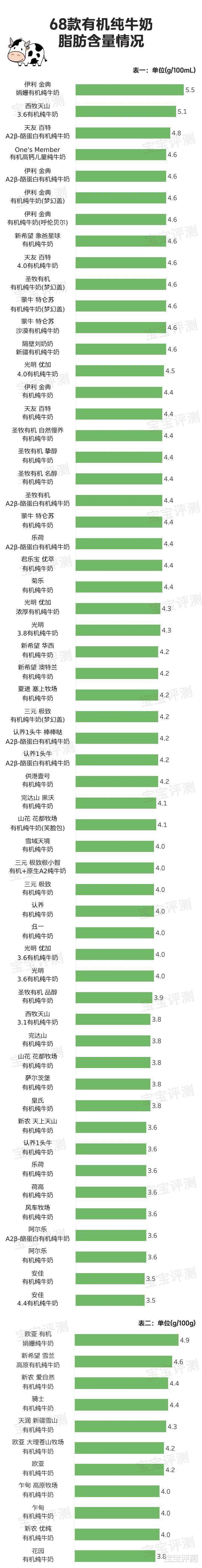 2、68款有机纯牛奶的脂肪含量在3.5-5.5g/100mL(100g)之间。
