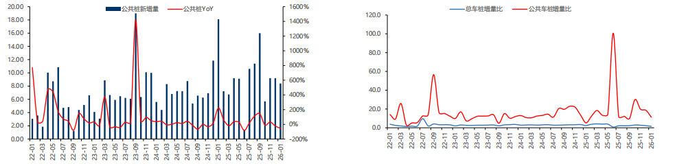 据中国充电联盟数据,截至2026年1月,国内公共充电桩保有量为480.1万台,当月新增公共充电桩8.4万台,国内车桩增量比为1.6,公共车桩增量比为11.3。