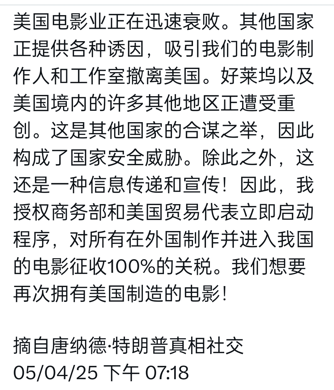 这场关税风暴不仅关乎电影票价,更折射出全球化制片体系的脆弱性。当特朗普高喊“让美国再次伟大”时,好莱坞却在追问:究竟是谁在摧毁电影产业的黄金时代?