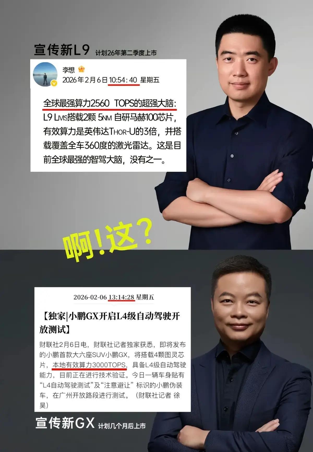 2月6日,北京时间上午,理想汽车李想刚在网上放话,全新L9顶配版搭载自研双马赫100芯片,算力高达2560 TOPS,直接喊出全球最强智驾大脑,没想到下午小鹏就甩出重磅消息。小鹏即将推出的旗舰大六座SUV GX,用上了4颗图灵芯片,本地算力直冲3000 TOPS,而且已经在广州的开放道路上实测L4级自动驾驶,这下理想的“最强”宣言还没热乎就直接被盖过了。这场新能源智驾大战来得太猛,短短几小时内两家车企隔空硬刚,算力从几百TOPS卷到几千TOPS,背后其实是大家对智能驾驶落地的疯狂追逐。理想这次选择全自研芯片路线,赌的是长期定制化和深度优化,能让车真正变成主动懂你的智能体,可风险也大,一旦落地慢就容易被对手超车。小鹏走的是合作加堆料的路子,借成熟芯片快速拉高算力,还同步推L4测试,显得更务实灵活,短期内体验迭代速度可能更快。算力高低只是起点,真决定智能驾驶好坏的还是算法调教、海量数据和真实场景验证,谁先把这些落地,谁就能笑到最后。消费者捡了大便宜,两款重磅SUV二季度前后上市,竞争越激烈,技术进步越快,我们开上更稳更聪明的车也越近了