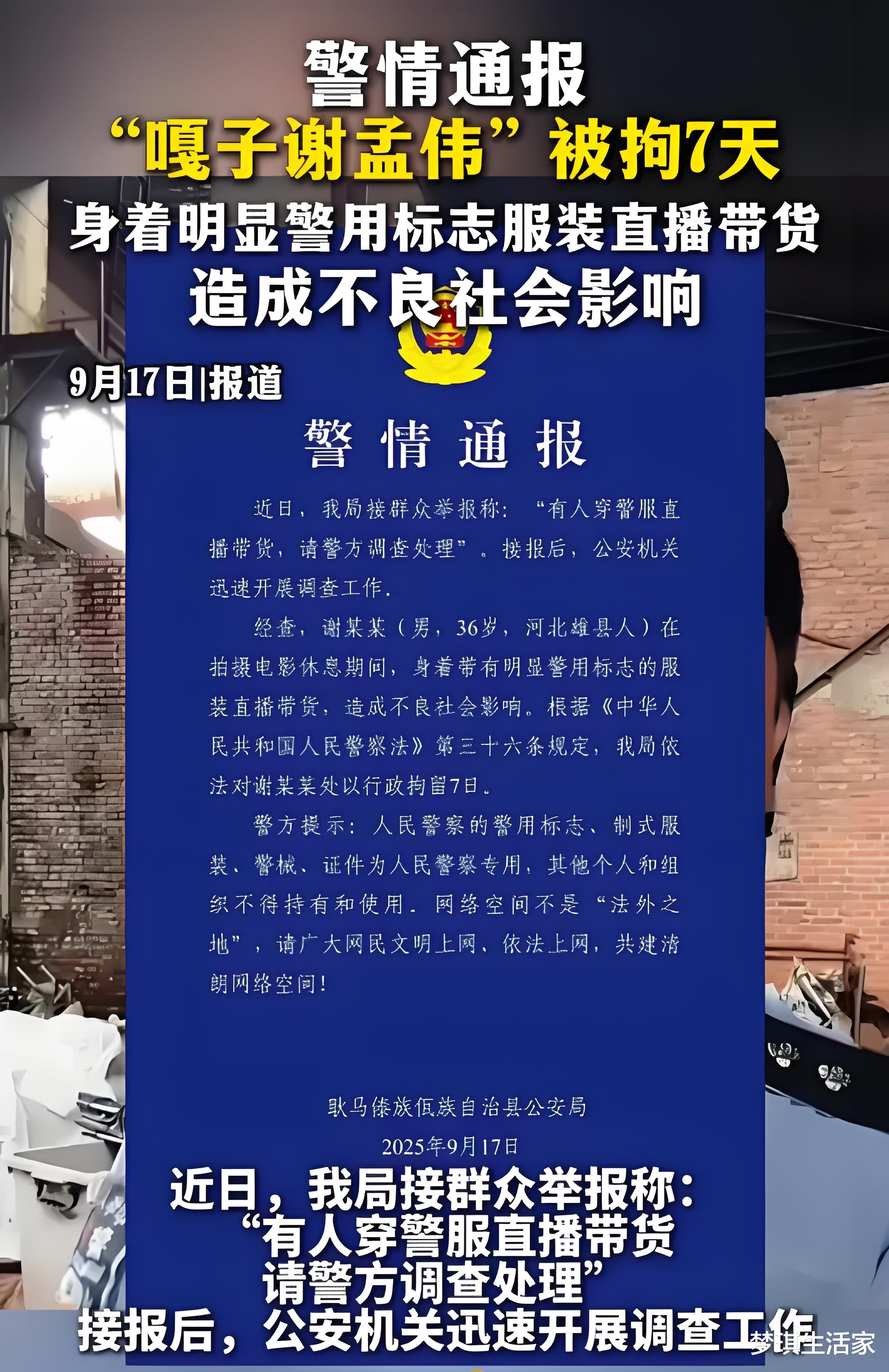 没过几天,云南耿马县公安局的通报就出来了:演员谢孟伟,因为非法使用警用标志和制服,依法拘留七天。这处罚,结结实实,一点水分都没有。