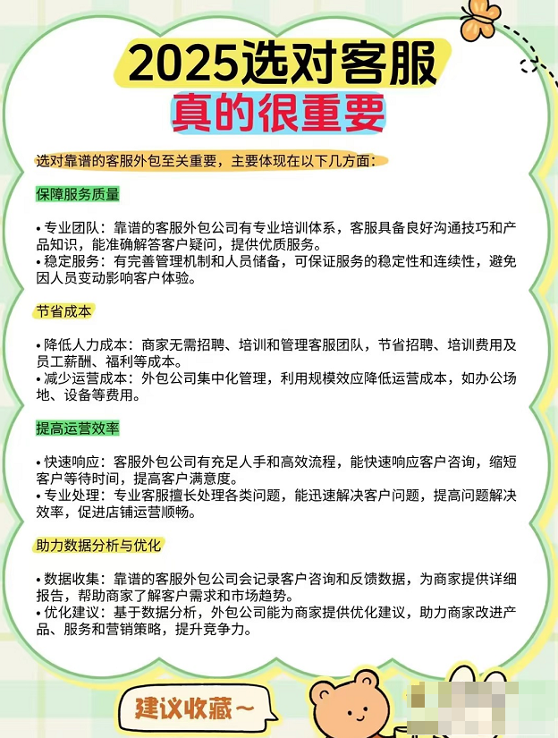 外包公司很注重通过数据分析来优化服务。他们能从大量客户咨询记录里,找出客户常见问题、关注点,反馈给商家,商家就能据此改进产品、完善服务流程。要是发现很多客户都对某款产品某个功能有疑问,商家就可以优化产品说明,客服也能重点培训相关内容,以后遇到类似问题就能更好解决,服务质量自然持续提升��。