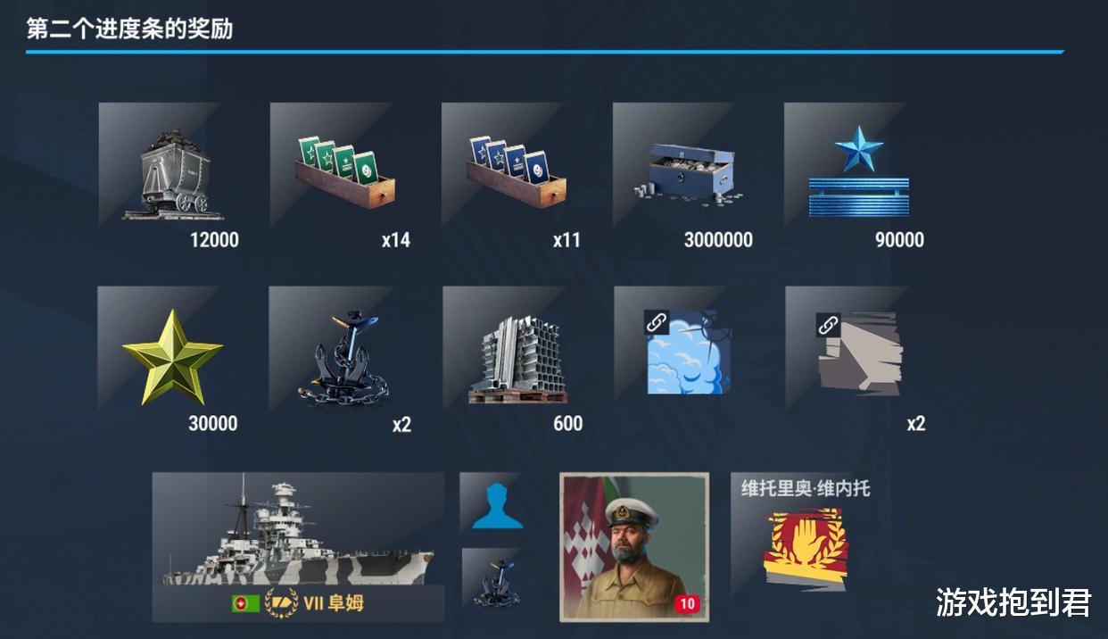 花费3000金币解锁第二条进度后,即刻获得“蓝色爆炸”敌舰摧毁特效,阜姆便在该进度中间位置,同时还能解锁2款“I系海军”永久涂装、带10个技能点的I系指挥官多梅尼科福尔戈,以及90000精英指挥官经验等丰厚奖励。
