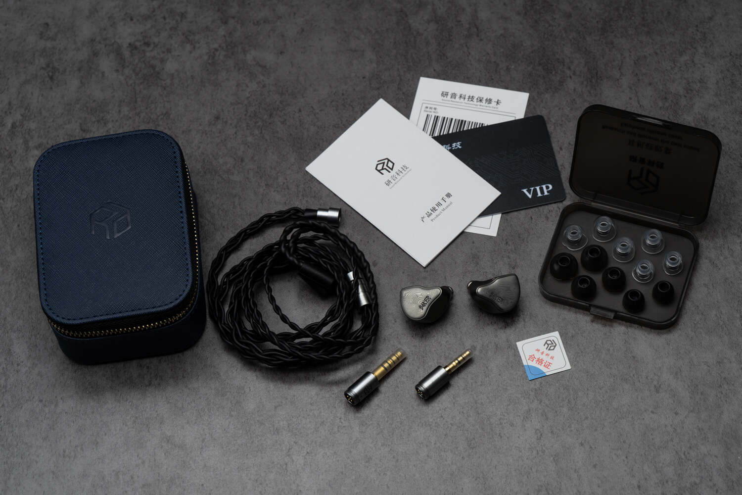 和卡门那种令人印象深刻的斜角对开纸包装盒比起来,Baker的包装要显得低调不少,里里外外都是黑灰色调;除耳机和线材外,还标配了一个深蓝色的拉链收纳包,做工精致,内部空间充足;以及两种材质的耳套。值得一提的是这个透明液态硅胶套,是目前为止我唯一一种能完美佩戴的液态硅胶耳套,搭配Baker佩戴贴合度、舒适度都很赞,不粘不痒,可以长时间使用。