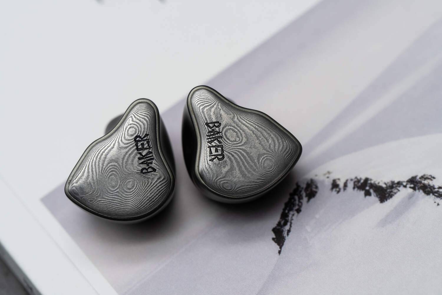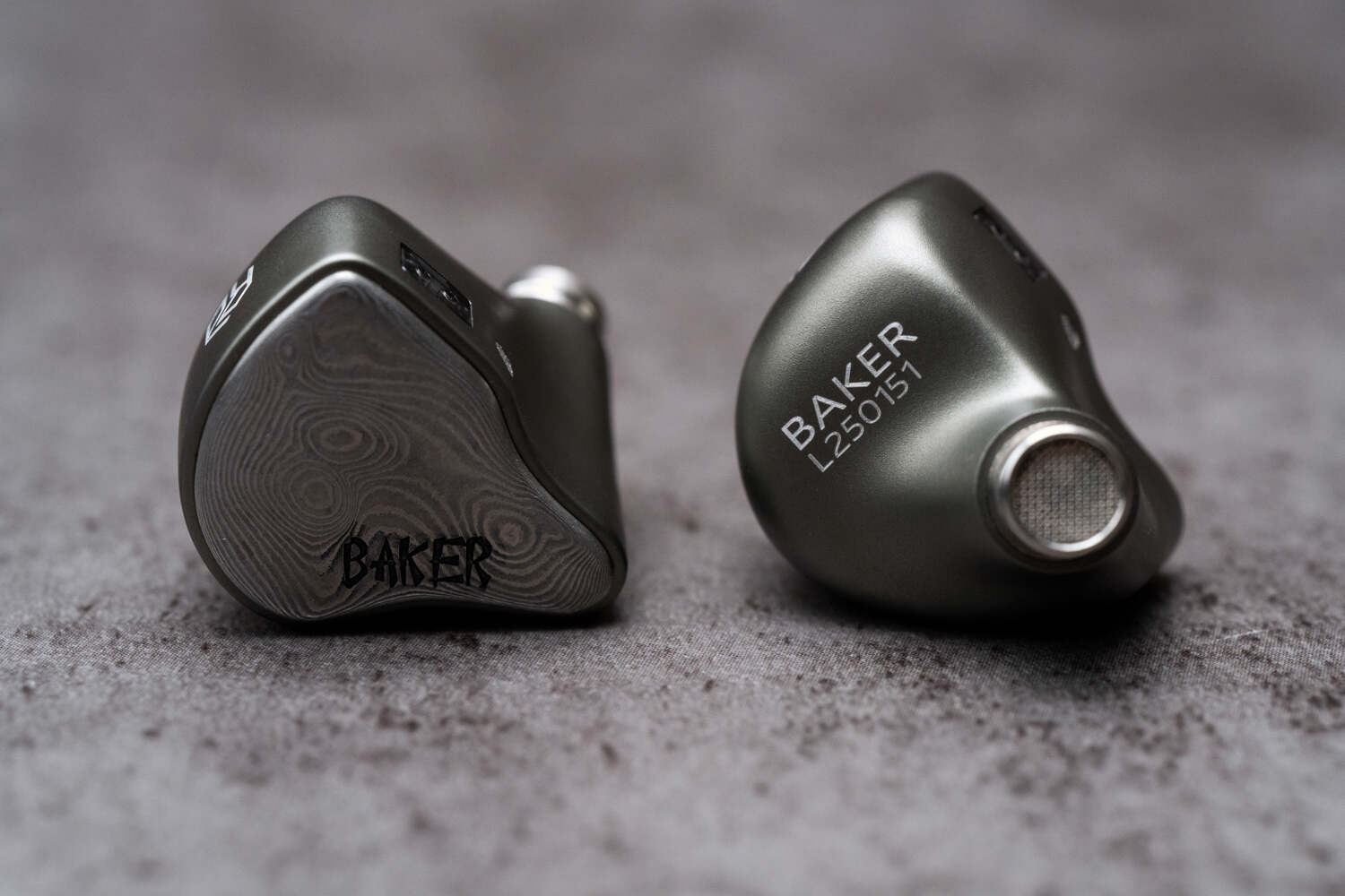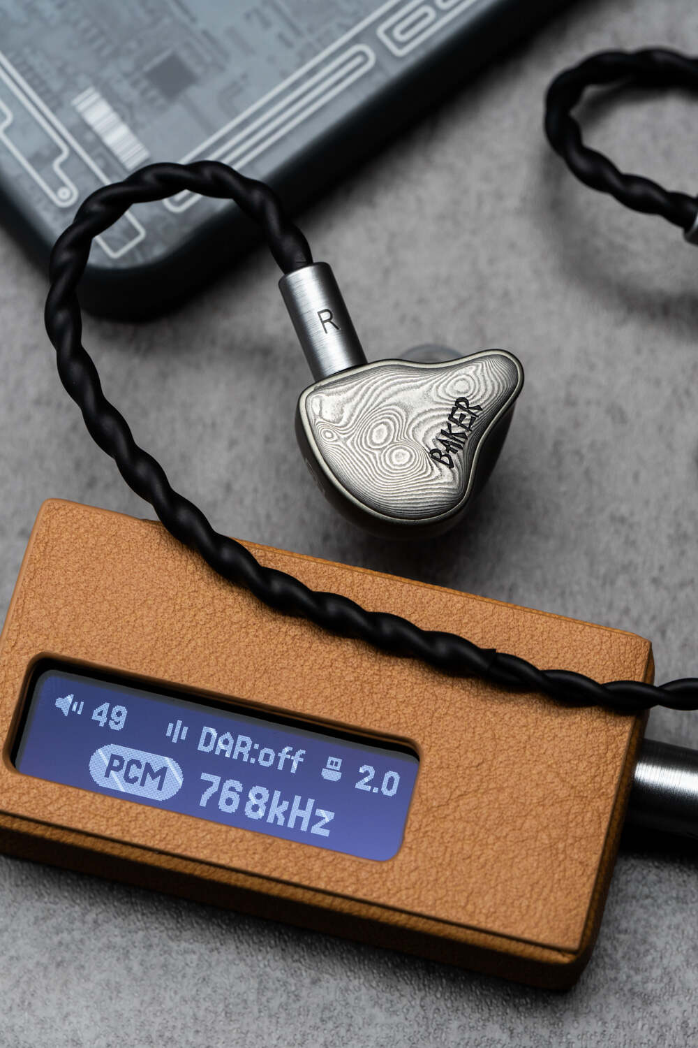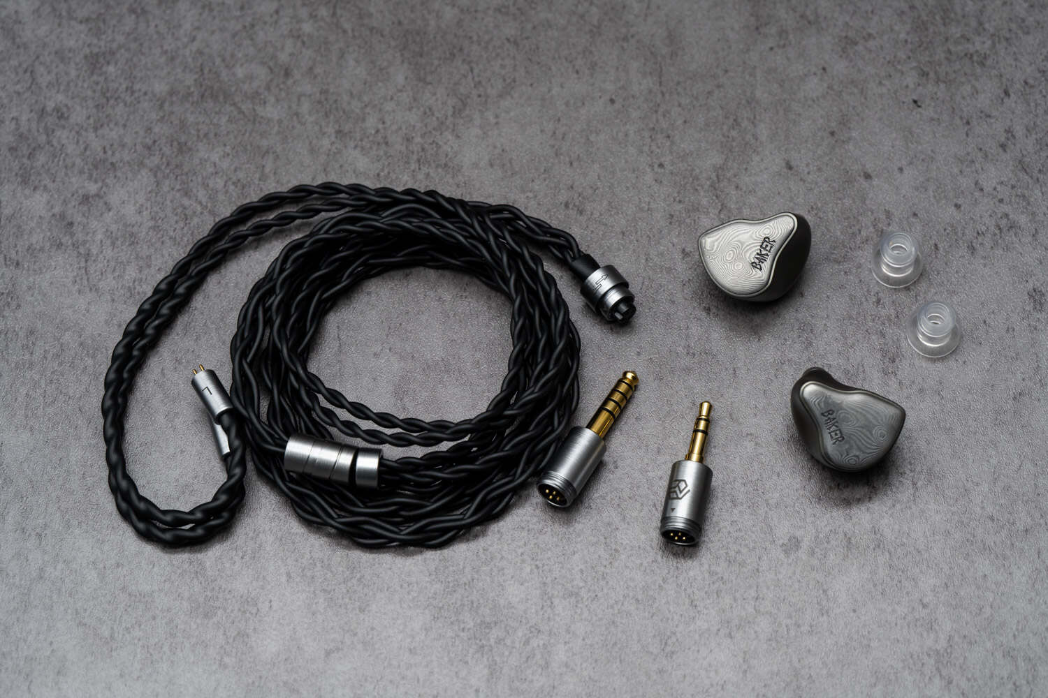 Baker的外观设计走的是硬朗的金属路线,腔体为铝合金材质(但看轮廓仍然能看出是研音家的东西),面板使用了大马士革钢——话说这玩意一般是在比较高端的产品上才用,而且Baker这个大马士革的质感、纹理精细度、耐磨程度都挺在线(个人觉得纹理再深一点会更好),我用了大半个月下来,两边单元也没做什么保护,硬是没有任何肉眼可见的磨损。Baker的面板纹路是比较浅的那种,并用同样的视觉风格刻上了Baker字样,总体呈现一种成熟、刚硬的外观风格。标配线材是深黑色外皮的6N单晶铜,自带3.5和4.4可换插头设计。插头与分线器、插针均为腔体同色,整体视觉协调度很高。