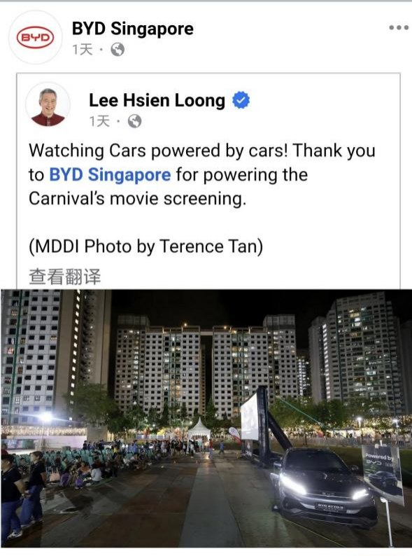新加坡国务资政李显龙出席现场,随后在社交媒体发文,特别感谢了比亚迪新加坡分公司对于本次活动的支持。