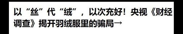 未曾曝光时难以知晓,原来众多羽绒服内所谓的羽绒竟是“飞丝”,更有黑心厂家以猪毛、狗毛、化纤来制作,实在令人震惊。